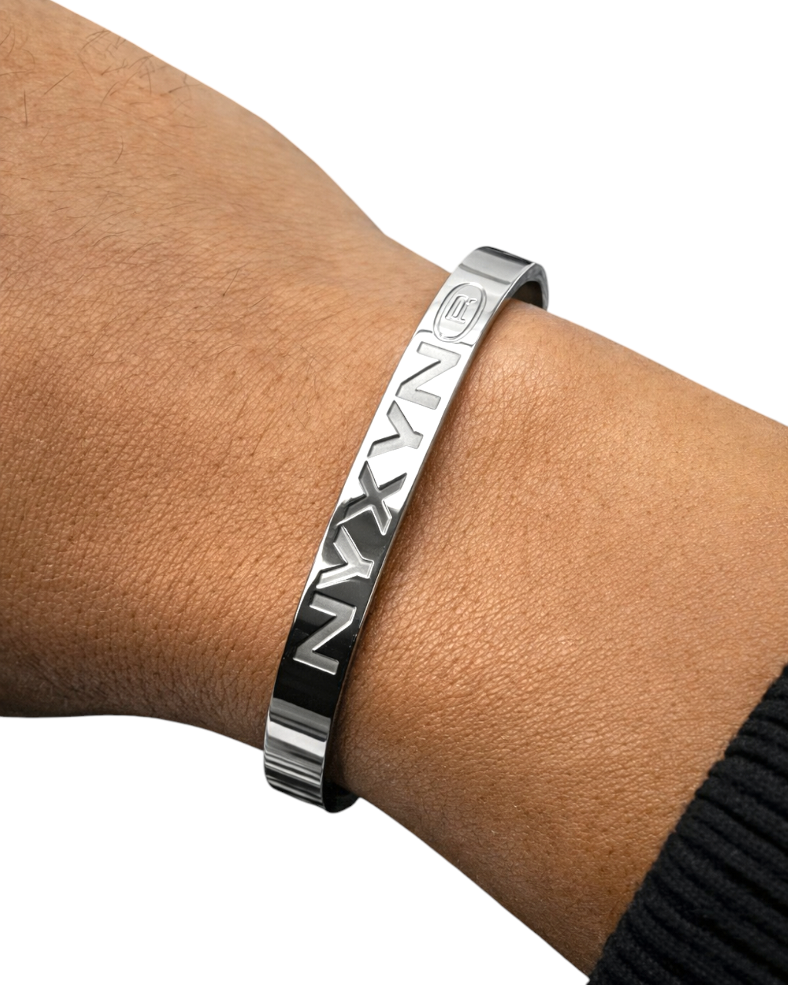 A solid stainless steel cuff with a mirror-polished finish.
